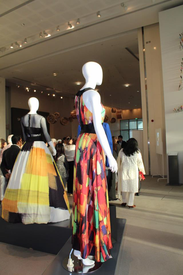 The fabric was turned into scarves, bow ties, pocket square & jacket liners. A UK based designer created a range of clothing using the silk with the canvas designs. The original artwork & finished designs were showcased side by side at an exhibition in Abu Dhabi.